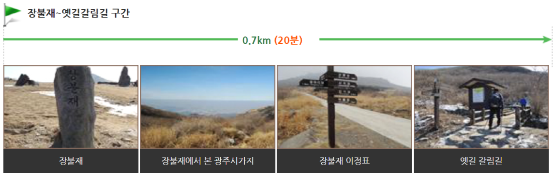 오솔길 같은 늦재 구간을 지나 옛길 2번을 경유하는 길로 무등산의 안과 밖 경치를 두루 감상할 수 있는 코스