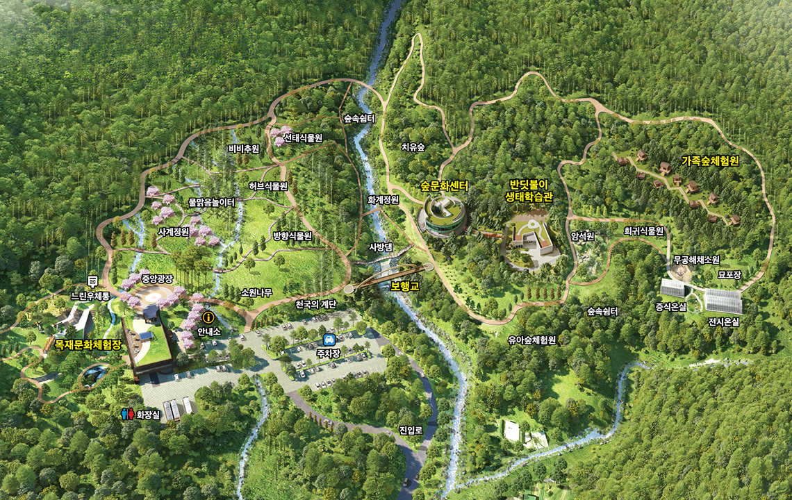 목재문화체험장, 유아숲체험원, 숲문화센터, 주제정원 등 다양한 수목을 감상하고 체험활동 또한 할 수 있는 곳입니다.
