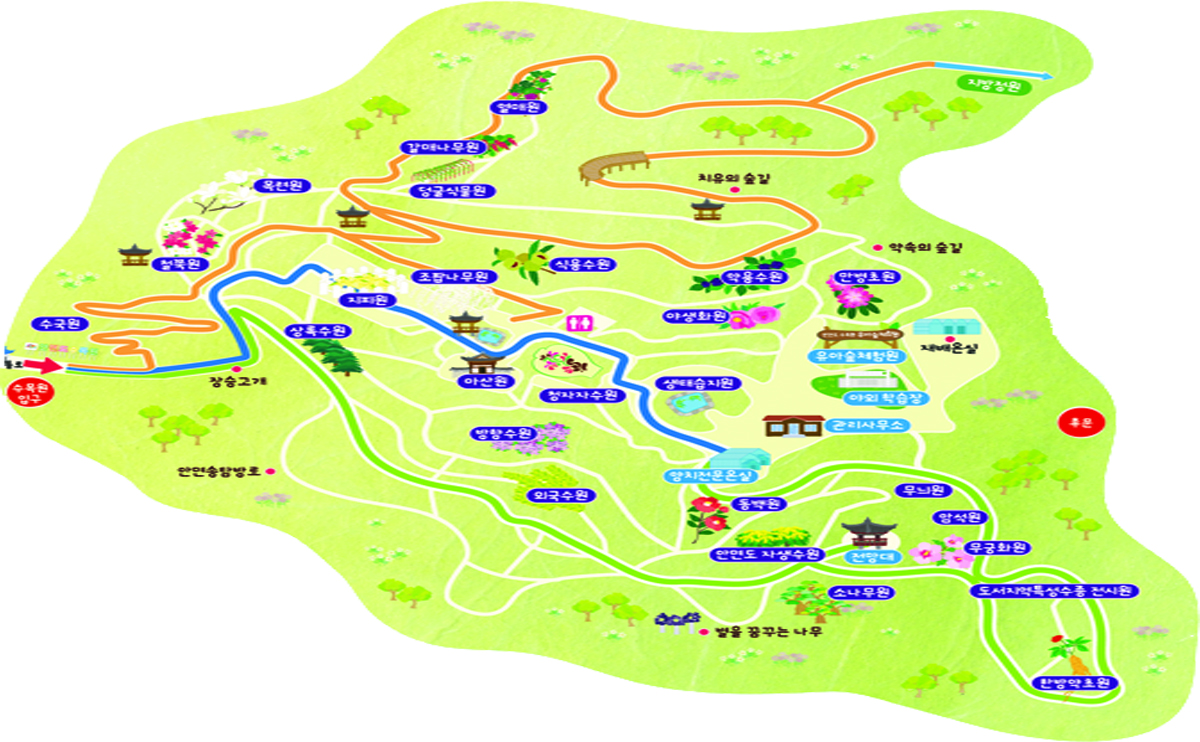 안면도 수목원은 여러 개의 테마원으로 조성되어 있는데요. 한국의 전통적인 정원의 멋이 발취된 아산정원, 늘 푸른 나무만으로 조성된 상록수원, 안면도에 자생하는 꽃과 나무들이 식재된 안면도 자생수원, 자연형태의 연못을 이용해 생태적 특성을 관찰해 볼 수 있는 생태습지원 등 다양한 테마원이 조성되어 있습니다.