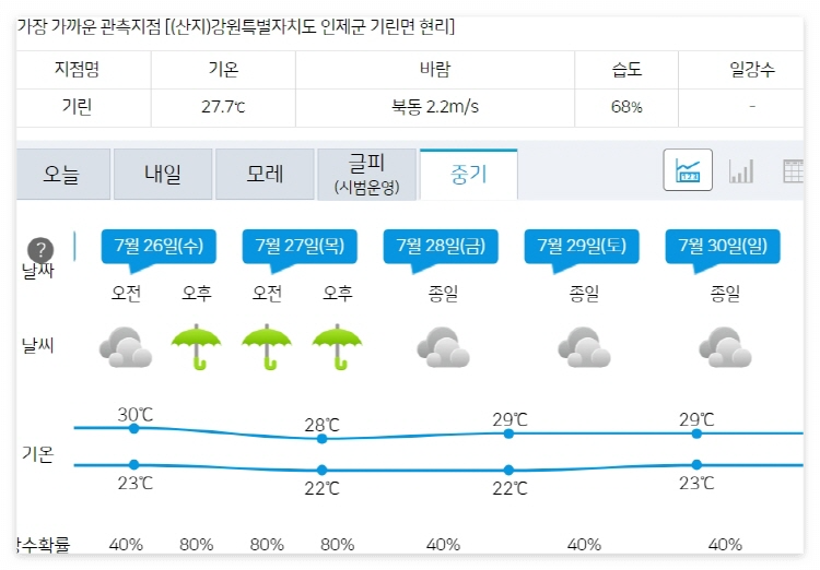 강원도 인제군 기린면의 날씨를 참고하시면 됩니다. 곰배령 날씨를 확인하시려면 아래 바로가기를 이용하세요