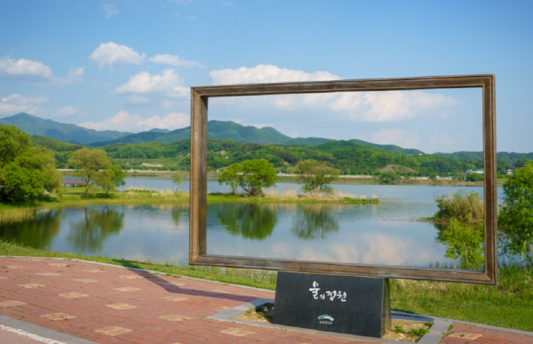 물의정원을 걷다 보면 뱃아들이교에 도착하는데요. 이곳은 물의정원을 상징하는 곳이자 과거에 배가 드나들던 자리라고 합니다. 뱃나들이교 앞에는 액자모양의 포토존도 마련되어 있습니다.