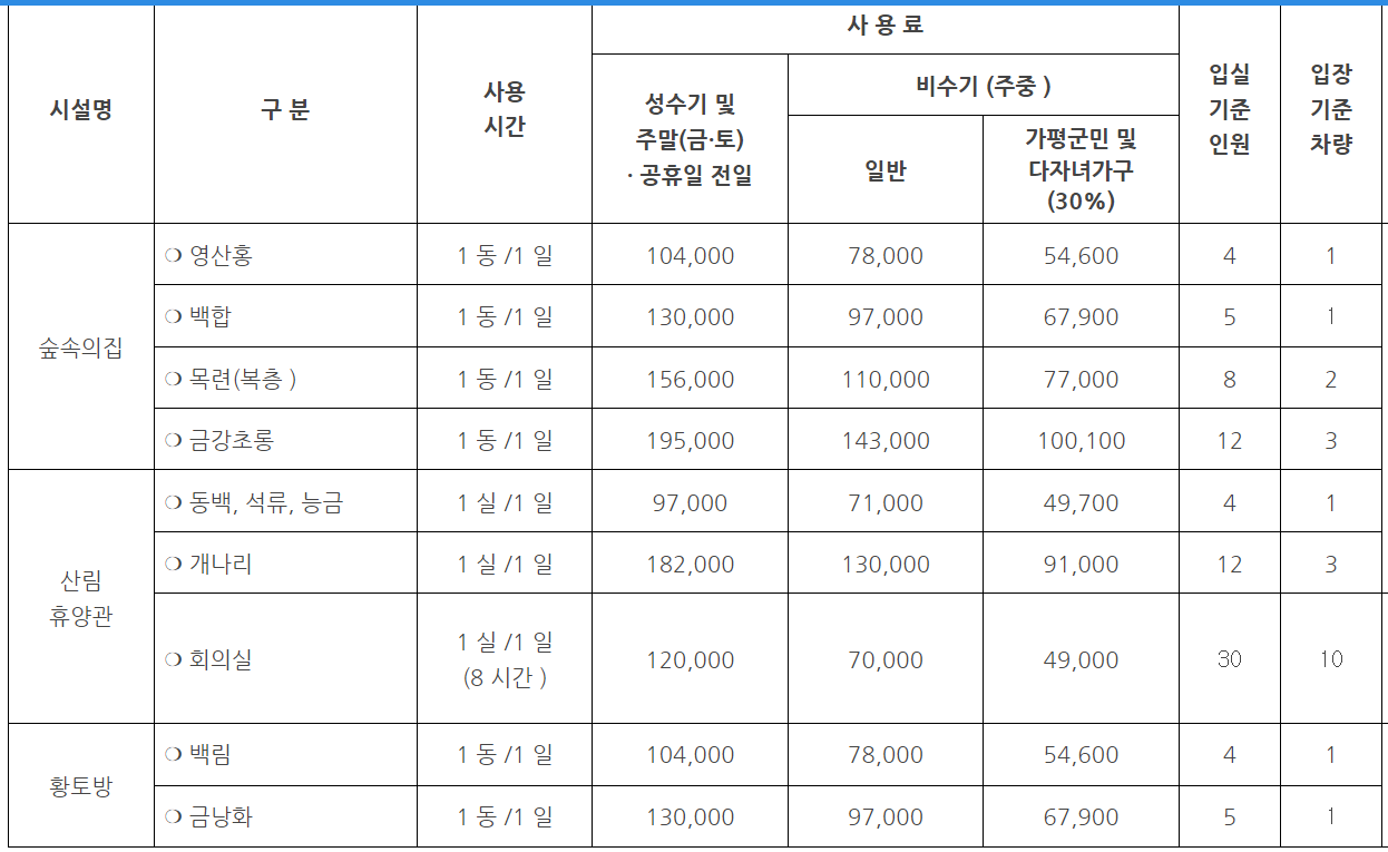 자연휴양림 배치도, 등산코스, 숙소 세부 정보 및 예약방법은 아래글을 참고하시기 바랍니다.