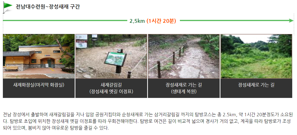 전남 장성에서 전북 정읍으로 넘어가는 코스로 넓고 완만한 경사로 부담 없이 탐방이 가능한 코스입니다. 순환형 코스가 아니어서 출발지와 종착지가 다르므로 교통편을 고려하여야 합니다.