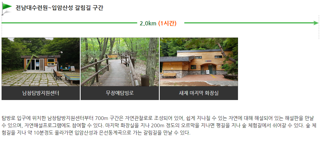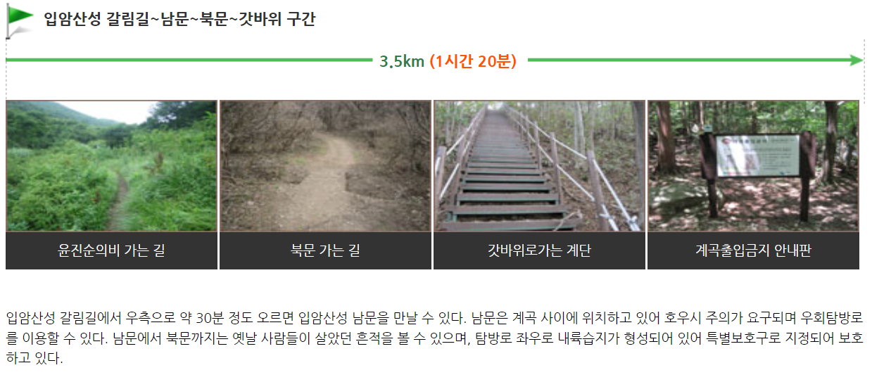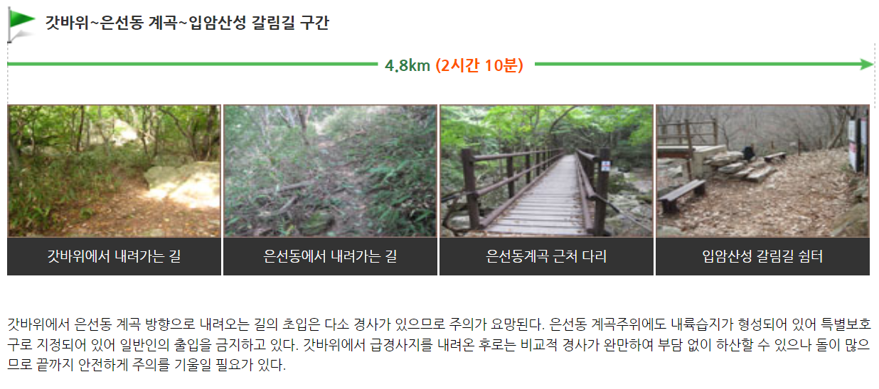 입암산성 갈림길을 중심으로 남문, 갓바위, 은선동 계곡을 순환하는 코스로 전체적으로 경사가 완만하여 초보산행자도 부담 없이 이용할 수 있는 코스입니다.