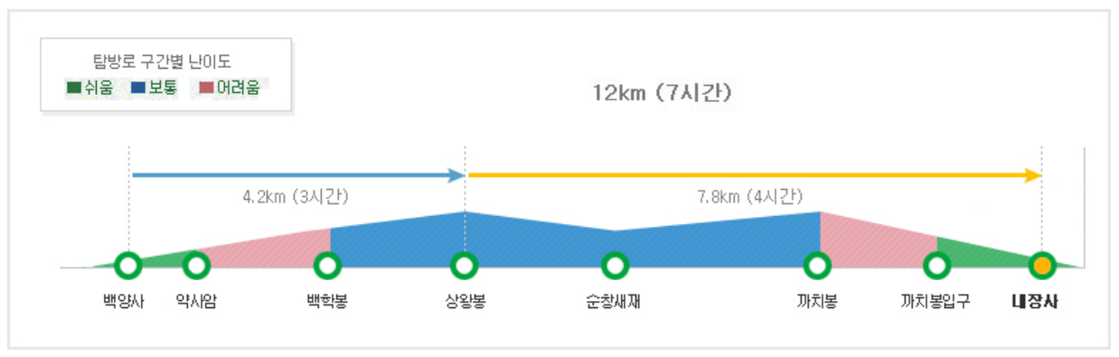 전남에 올라 전북에서 내려오는 코스로 산행에 숙련된 등산객에게 추천하는 코스입니다. 산행 난이도가 높긴 하지만 백암산과 내장산의 절경을 동시에 느낄 수 있는 코스입니다.