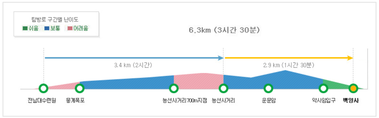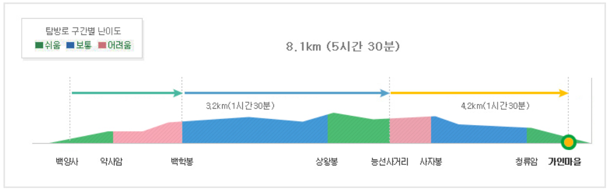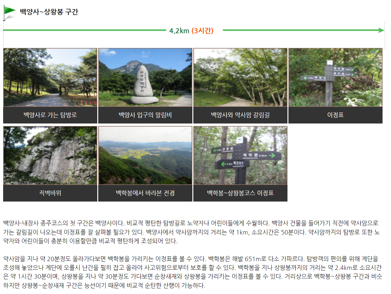 전남에 올라 전북에서 내려오는 코스로 산행에 숙련된 등산객에게 추천하는 코스입니다. 산행 난이도가 높긴 하지만 백암산과 내장산의 절경을 동시에 느낄 수 있는 코스입니다.