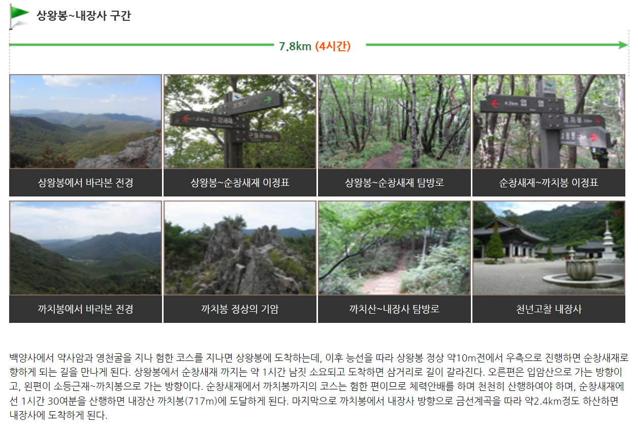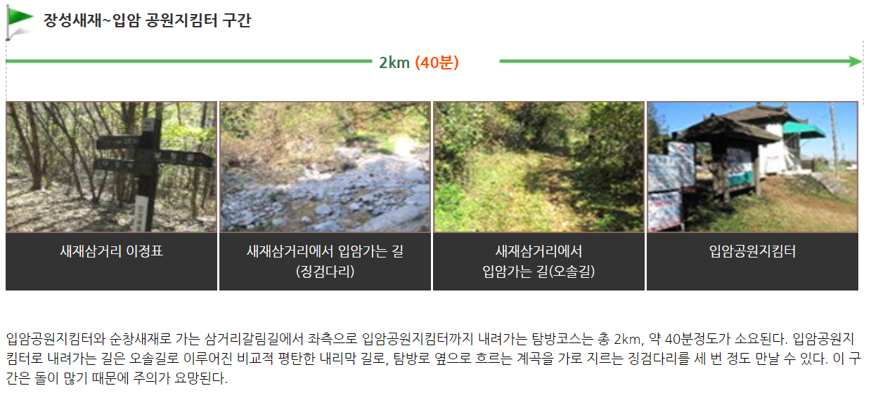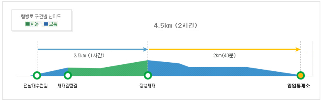 전남 장성에서 전북 정읍으로 넘어가는 코스로 넓고 완만한 경사로 부담 없이 탐방이 가능한 코스입니다. 순환형 코스가 아니어서 출발지와 종착지가 다르므로 교통편을 고려하여야 합니다.