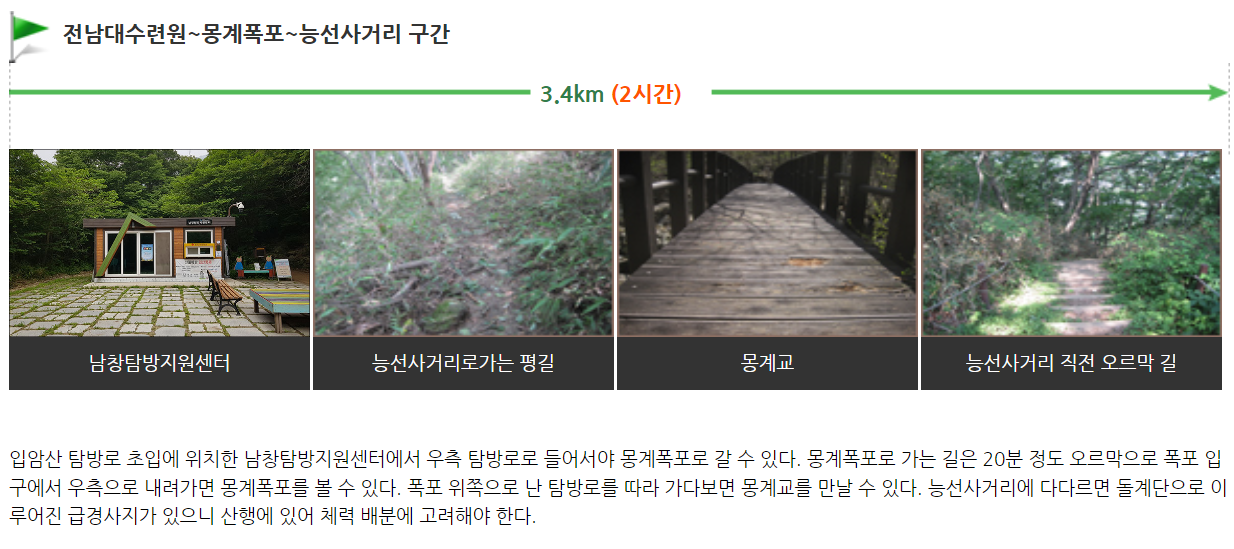 내장산 국립공원의 대표폭포인 몽계폭포의 절경과 시원한 계곡을 따라 산행을 할 수 있는 코스입니다.
